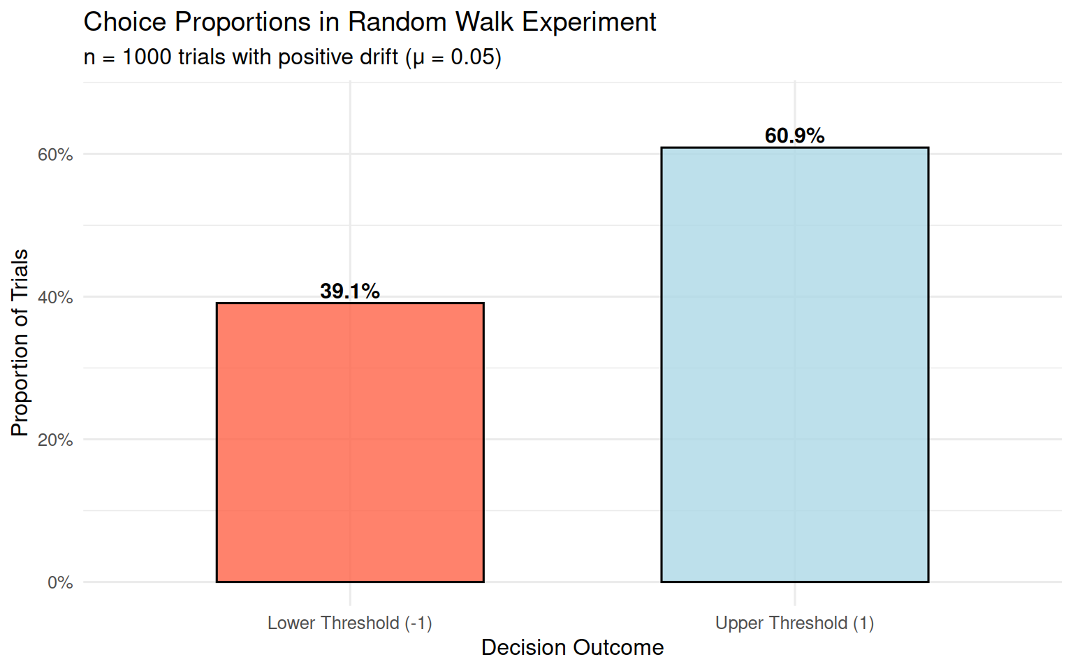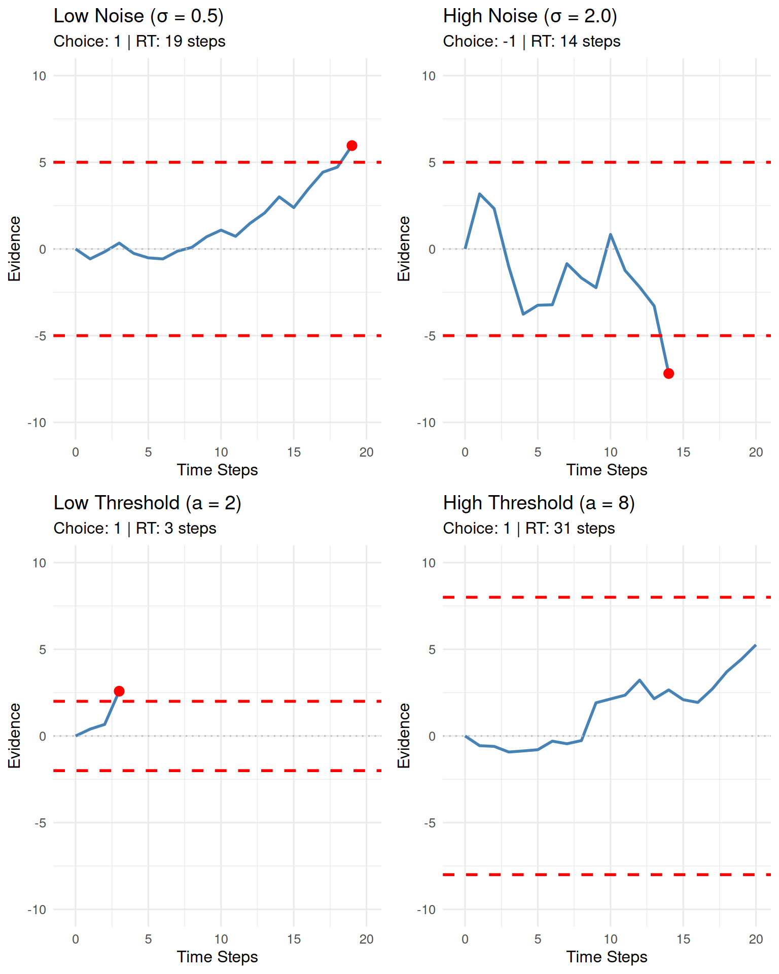 Random walks provide the foundation for understanding: - Evidence accumulation in perceptual decisions - Response time distributions in choice tasks - Confidence and decision certainty - Individual differences in decision-making strategies