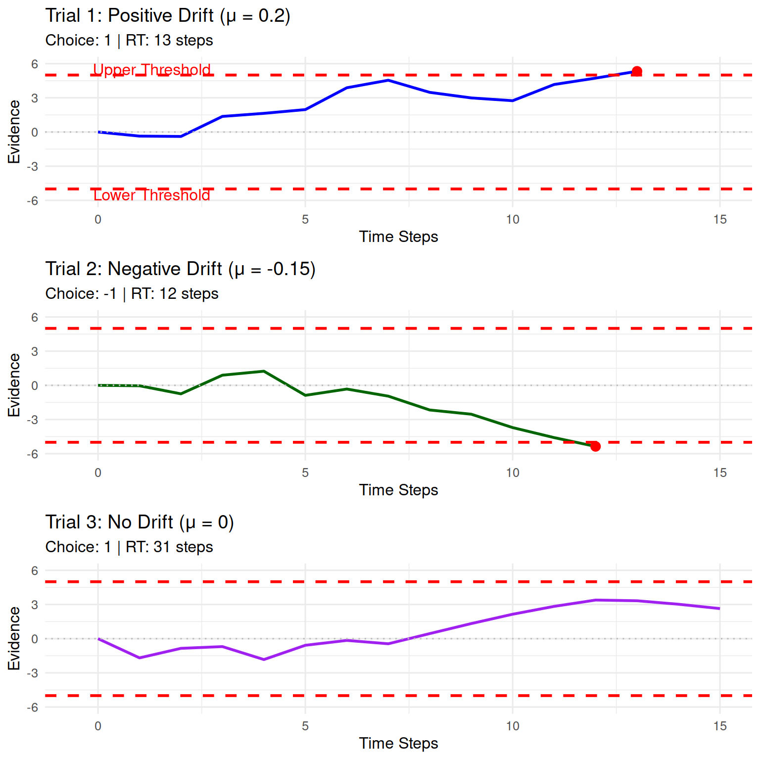 The process continues until the evidence crosses one of two decision boundaries: - Upper threshold: \(E_t \geq +a\) → Decision “A” (choice = 1) - Lower threshold: \(E_t \leq -a\) → Decision “B” (choice = -1)