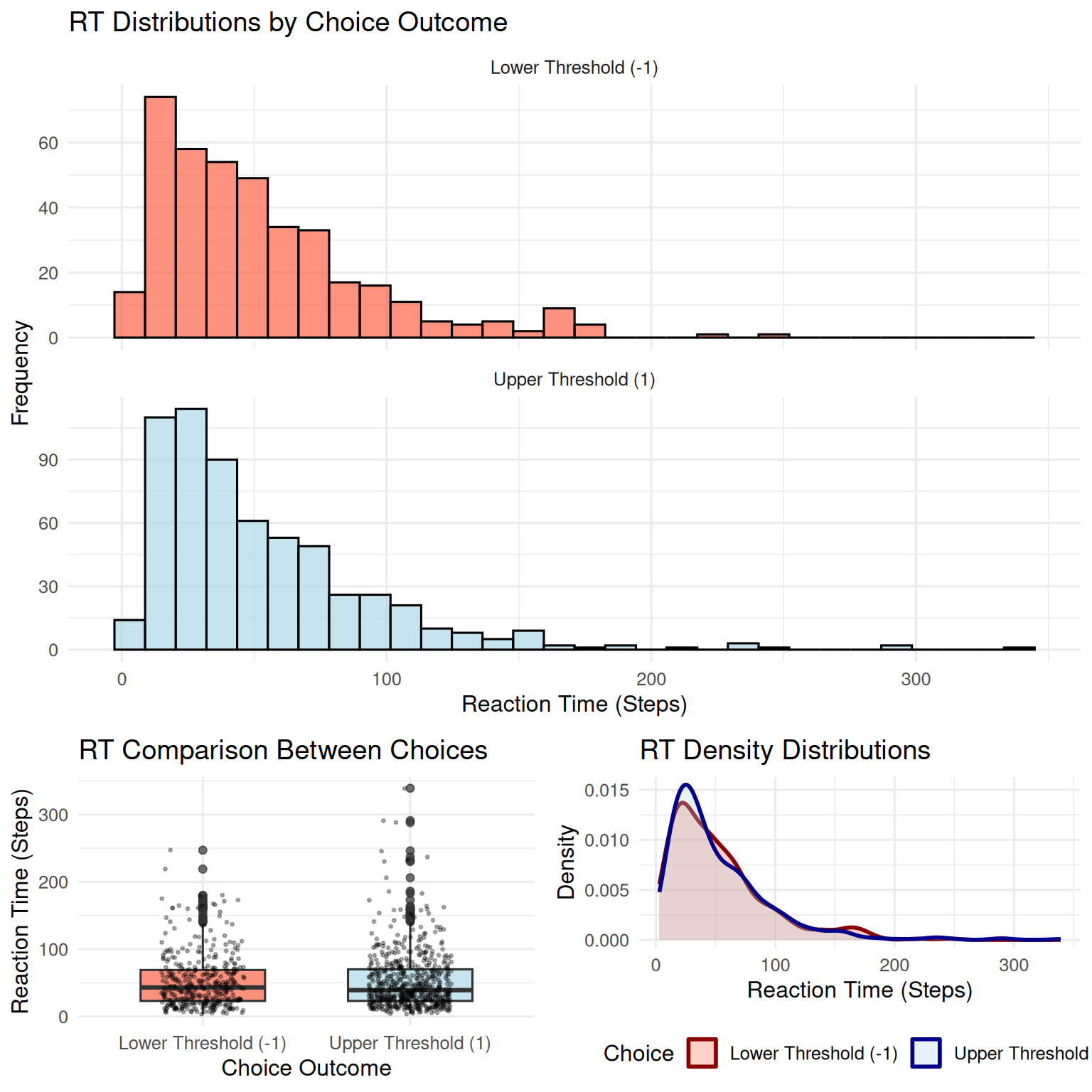 Key Insights from RT Analysis: - RT distributions are typically positively skewed (long right tail) - Faster RTs often occur for the choice favored by drift - Slower RTs may indicate more difficult decisions or unfavorable drift - The variability in RTs reflects the stochastic nature of the process