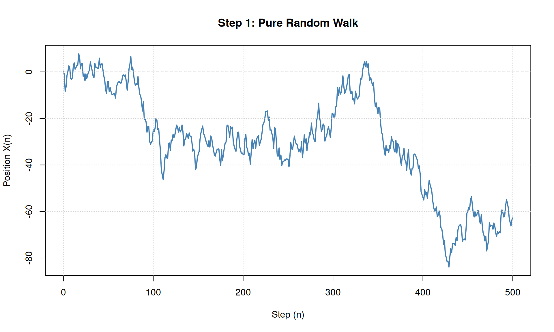 main = "Step 1: Pure Random Walk",